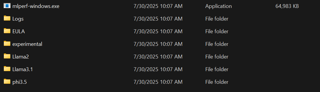 The MLPerf Client benchmark is distributed as a Zip file. Once you’ve downloaded the Zip archive, extract it to a folder on your local drive. Inside the folder you should see a few files, including the MLPerf Client executable and several directories containing JSON config files for specific brands of hardware.